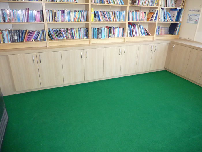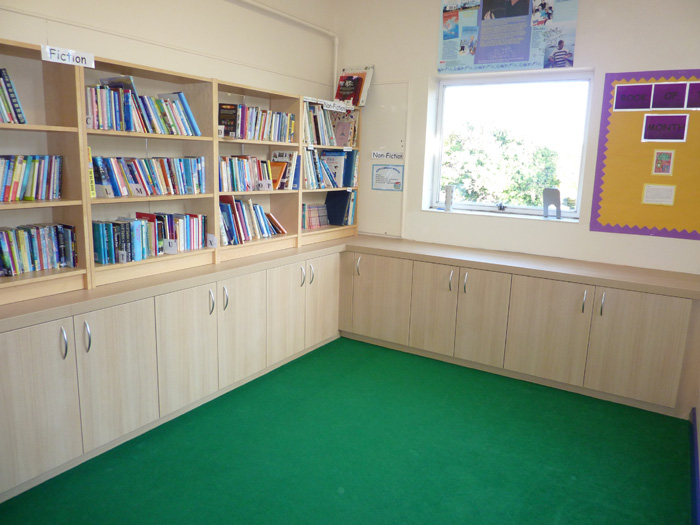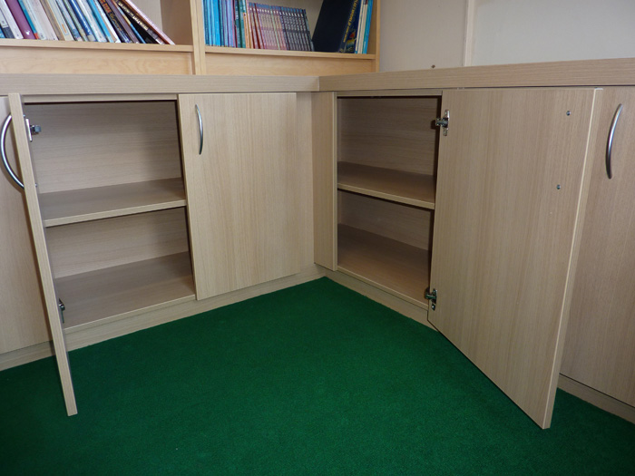 Made from 18mm Light Ferrara Oak (worktop 50mm Light Ferrara Oak), which not only matches the computer desks, but is also as close as possible to the school's existing shelving units.