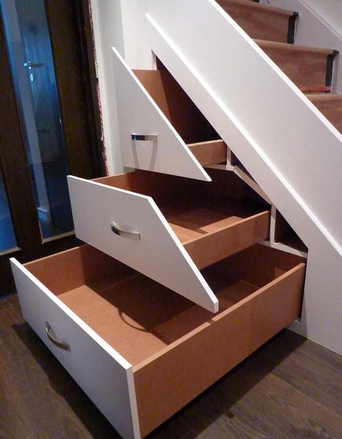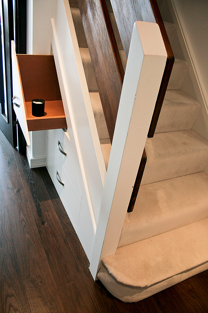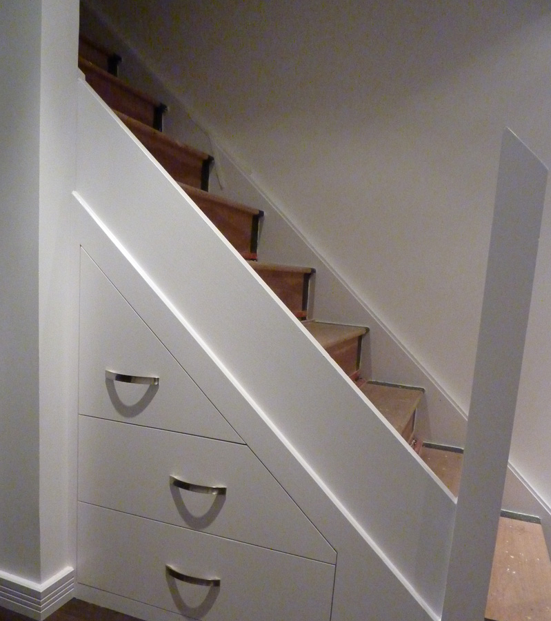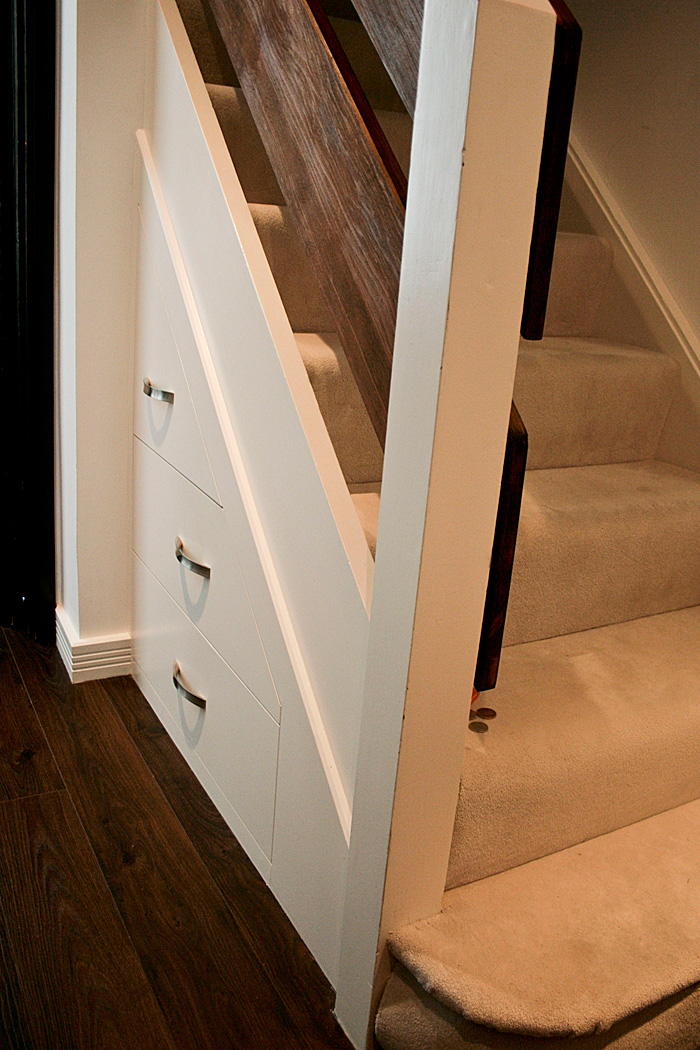 Made from MDF, painted front panels, extra long (750mm) deep drawer boxes and runners that could carry up to 50 kg. It turns the space almost every house has into one with so much better use.